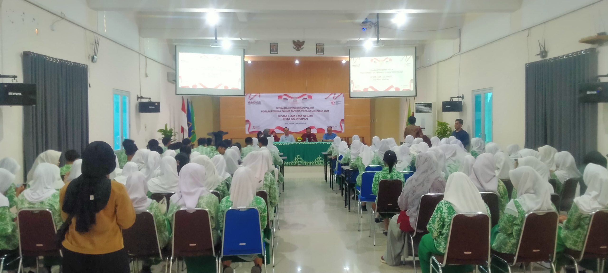 Bertempat di Aula SMK Negeri 2 Balikpapan sosialisasi yang bertemakan “Sosialisasi Pendidikan Politik Pemilih Pemula Dalam Rangka Pilkada Serentak 2024 Di SMA/SMK/MA Negeri Kota Balikpapan.” Ini pun juga menghadirkan 2 narasumber yang berkompeten di bidangnya ialah Farida Asmauanna dari komisioner KPU kota Balikpapan divisi Teknis Dan Penyelenggaraan serta imam Arrywibowo yang berasal dari akademisi sekaligus dosen Fakultas Ekonomi dan bisnis universitas Balikpapan.