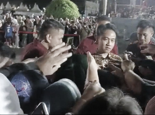 Ketika turun dari kendaraan,terlihat Gibran yang memakai baju batik dan di kawal Paspampres tersebut melambaikan tangan sembari membagikan gantungan kunci kepada warga.